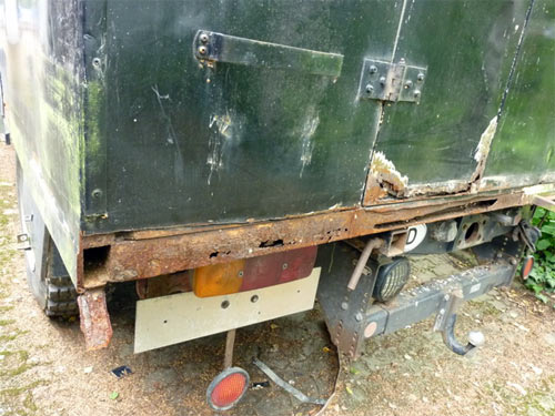 Nun habe ich einen Kurzhauber, der leider seit nunmehr fast 5 Jahren unter freiem Himmel steht (zwar abgedeckt, aber nicht wirklich geschützt). Die (Wohnmobil-) Einbauten von meinem Vorgänger habe ich zum großen Teil wieder herausgeholt, da die Isolation nicht so dolle waren und das Kondenswasser an einigen Stellen Korrosion verursacht hat. Die haben wir zum Glück in den Griff bekommen, allerdings rostet der Kofferrahmen im unteren Breich. Der Vorgänger hatte die geniale Idee, Riffelblechwinkel rundum anzubringen. Sieht zwar ganz nett aus, ist aber nicht wirklich toll für den Rahmen.
