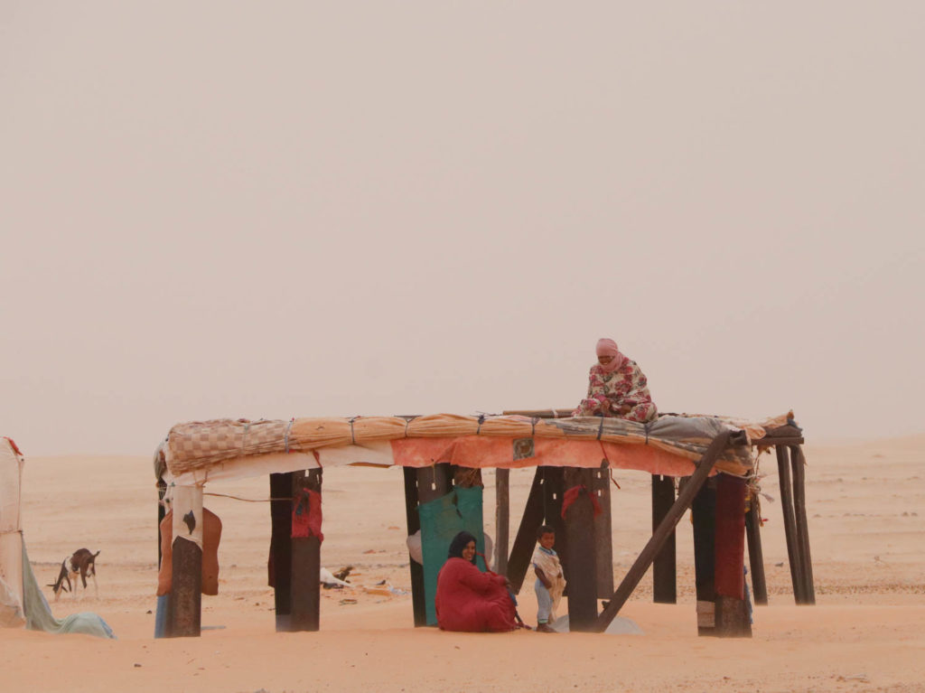 Kurz darauf sind wir in dem Ort Tmeimichat. Wir müssen bei der Polizei vorstellig werden und ein „Fiche“, einen vorbereiteten Zettel mit personenbezogenen Daten, abgeben. (Nebenbei: Über 50 Stück werden wir davon auf unserem Weg durch Mauretanien brauchen). Auf dem Weg zur Polizeistation passieren wir ein Dorf, das sich kein Filmemacher besser hätte ausdenken können: So sieht es aus, das Leben nach dem Atomkrieg, nach dem Weltuntergang. Die letzten Überlebenden, das sind Kinder und Frauen. Bereits von Weitem laufen sie unserem LKW entgegen, teils barfuß, große Staubwolken hinter sich herziehend. Und sie brüllen uns an: „Geschenke!“ und „Gebt uns Geld!“, Die Hütten sind nur Wellblechverschläge. Krähen fliegen krächzend umher. Die Luft ist voll von Staub und Dreck, das Wetter drückend und trübe.