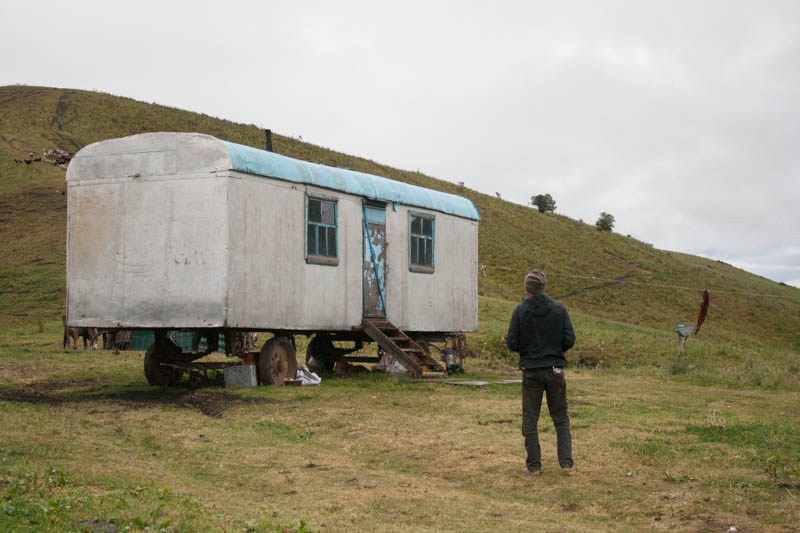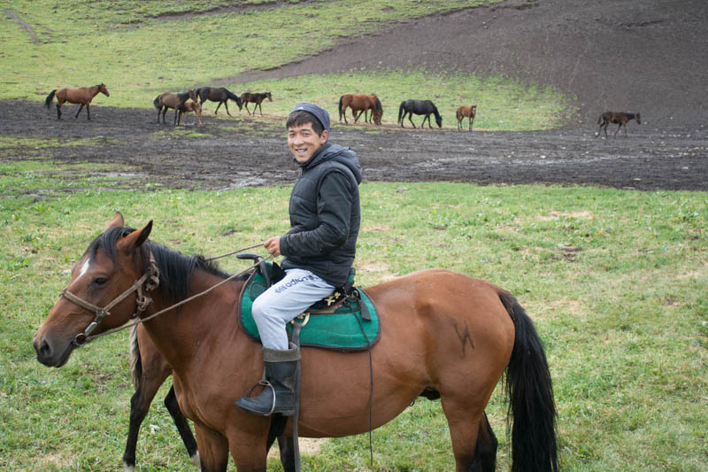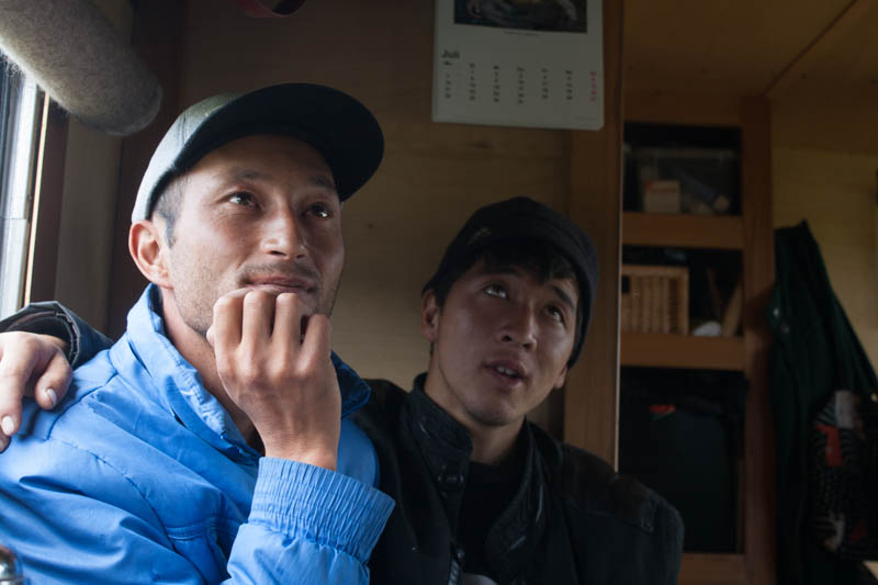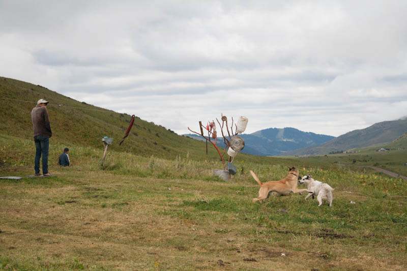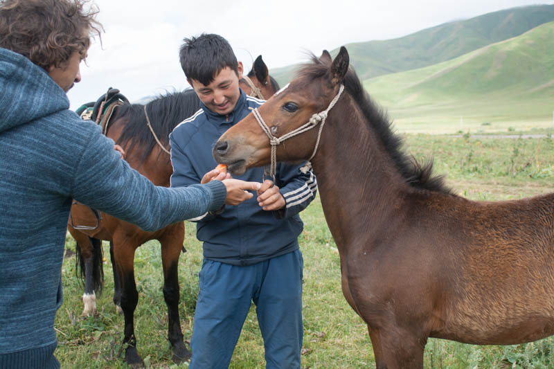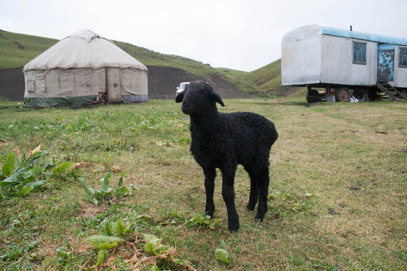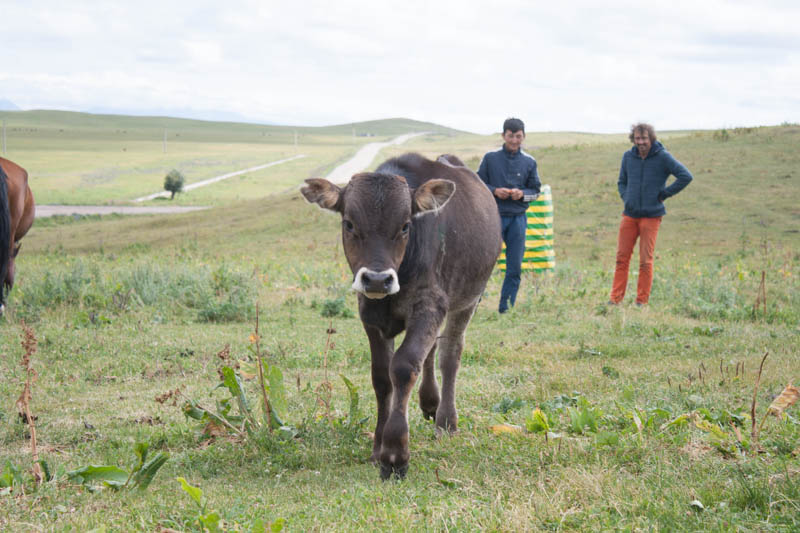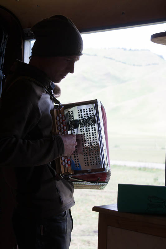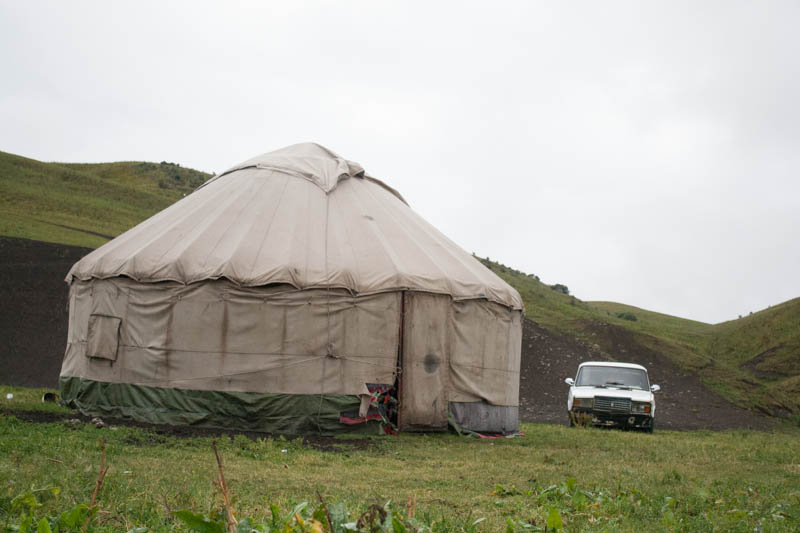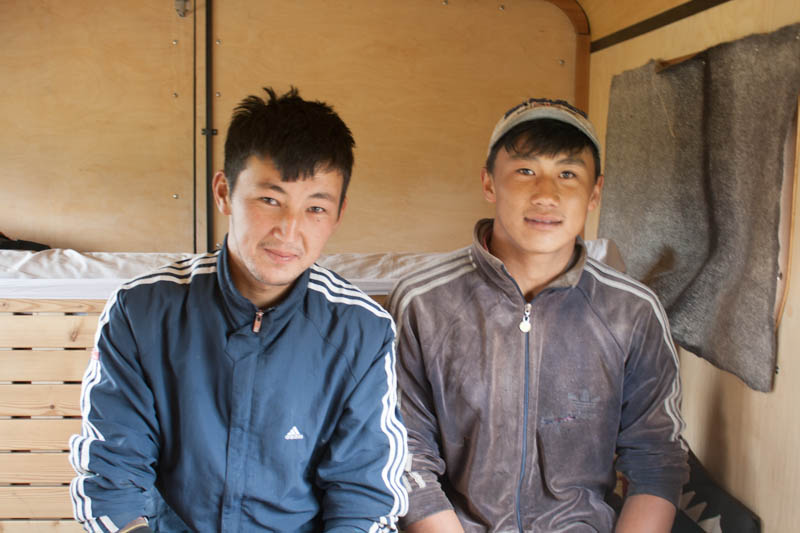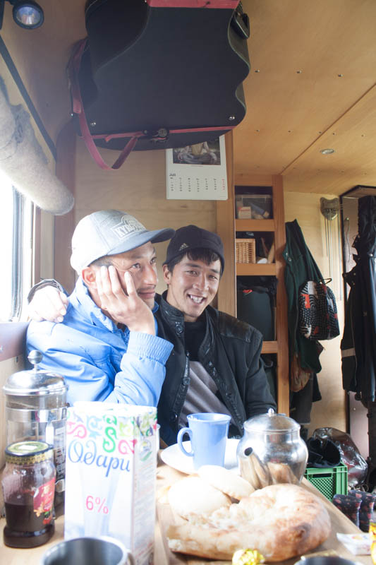Wir sind neugierig, wie so ein kirgisischer Bauwagen wohl eingerichtet ist. Frech laden wir uns kurzerhand selbst ein und fragen bei einer kirgisischen Familie an, ob wir uns einfach mit unserem Laster dazu stellen dürfen. Klar, dass man hier nicht nein sagt. Vater und Mutter und eine große Schar Kleinkinder sind zwar gerade auf dem Weg ins Dorf, aber die drei jungen Burschen zwischen 20 und 23 freuen sich über die willkommene Abwechslung und unseren Besuch. Der Wagen ist pragmatisch eingerichtet. Gleich am Eingang ist die Küche. Über einer Schnur sind Fleischstücke zum Trocknen aufgehängt. Es riecht ungewohnt. Der linke Teil besteht aus einem Sitzpodest, einem niedrigen Tisch und Polsterauflagen am Boden. Das Dach ist undicht und es tropft auf die Sitzpolster. Rechts befindet sich ein Schlafzimmer. Dort wird auch der Kumis in einem Holzfass vergoren.