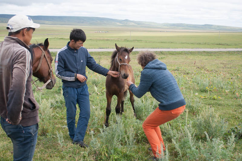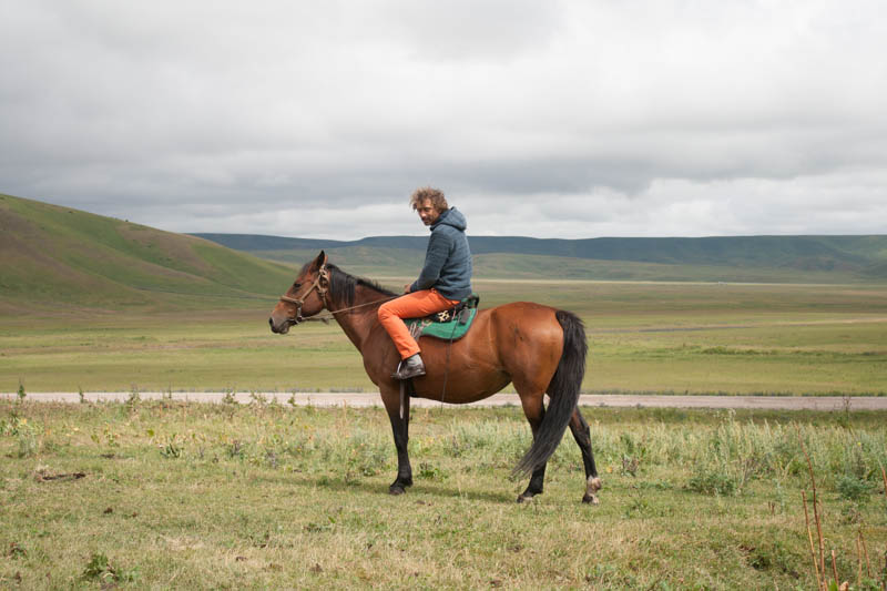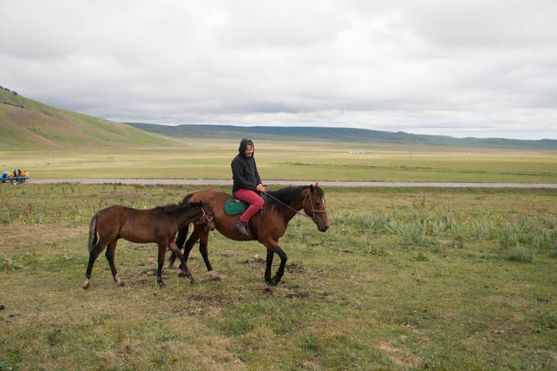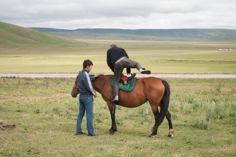 Wir bekommen eine Einführung: Auf den Rest Kumis im Fass wird neue Stutenmilch gegossen. Durch ein Loch im Deckel wird mit einem Holzstampfer Luft in die Milch gedrückt. Das muss man dann ungefähr 20 Minuten lang machen, und spätestens am nächsten Tag gibt es neuen Kumis. Natürlich dürfen wir nun auch probieren. Dieser hier schmeckt etwas gewöhnungsbedürftig, wild und säuerlich. Unsere mitgebrachten Süßigkeiten aus Kasachstan, Gummibärchen aus Deutschland und weitere Kleinigkeiten wie Streichhölzer, Teelichter und Buttons kommen gut an. Die Jungs lassen es sich nicht nehmen, uns eine Kleinigkeit zum Essen zu servieren. Es gibt „Beshbarmak“, was so viel heißt wie „Fünf Finger“, also „Fingerfood“. Wir bekommen netterweise einen Löffel dazu, denn die Suppe aus ausgekochtem Hammelfett mit zerkochten Nudeln und großen Fettstücken, wäre mit den Fingern nur schwer zu essen. Das Gericht ist nicht so ganz mein Fall, auch Matthias versucht zu schlucken, ohne zu schmecken. Nur Heppo lässt sich noch einen Nachschlag geben.