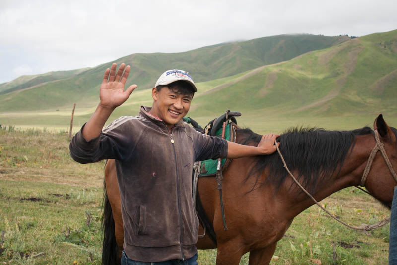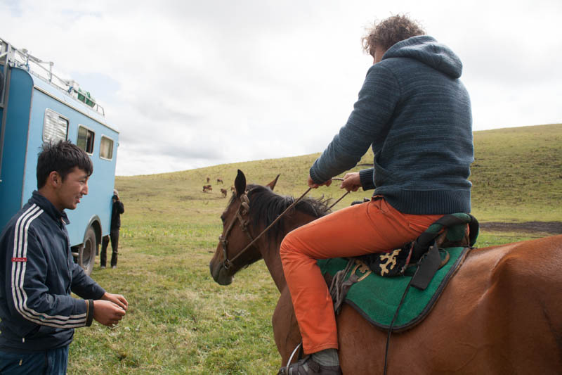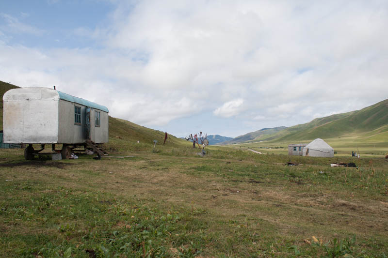 Schon seit Russland ist uns immer wieder aufgefallen, dass es Leute gibt, die im Bauwagen wohnen. Bisher dachte ich ja immer, dass wegen den langen Wintern spätestens ab Polen Schluss sei mit der Wagenbewohnerei. Aber auch in Kasachstan gab es zum Beispiel Imker, die im Lastwagen wohnen und einen Anhänger voller Bienenstöcke mit sich führen. Und jetzt in Kirgistan sehen wir nur noch Bauwagen. Die Jurte, die hier übrigens Bosü heißt, hat fast ausgedient. Und so reiht sich Postkartenmotiv an Postkartenmotiv: Bauwagen neben Pferdekoppeln neben Bienenlastern neben Bosü.