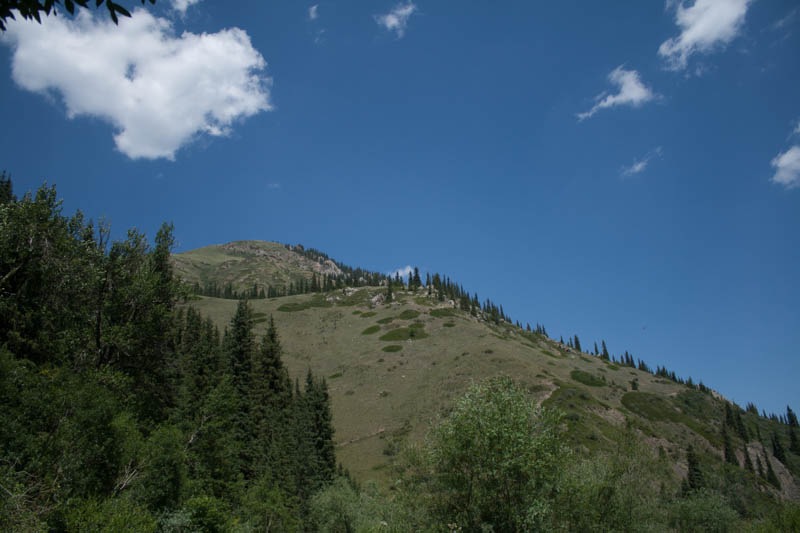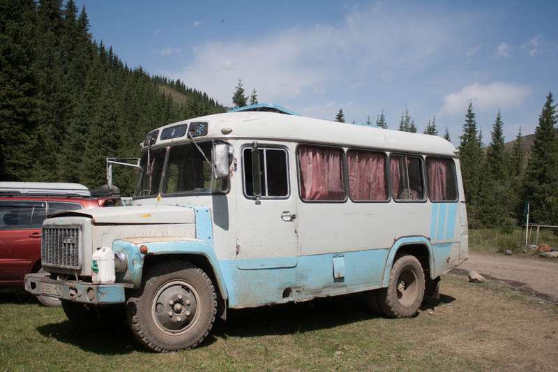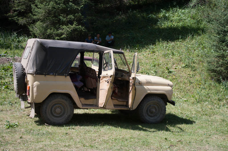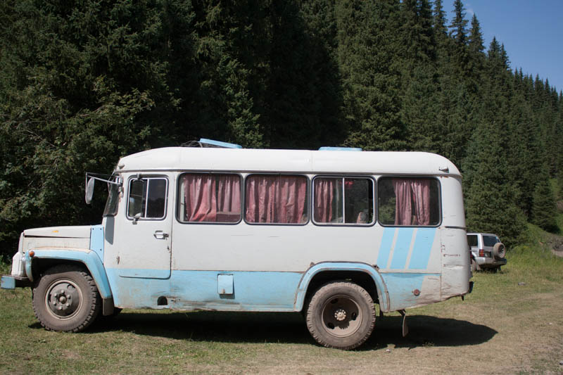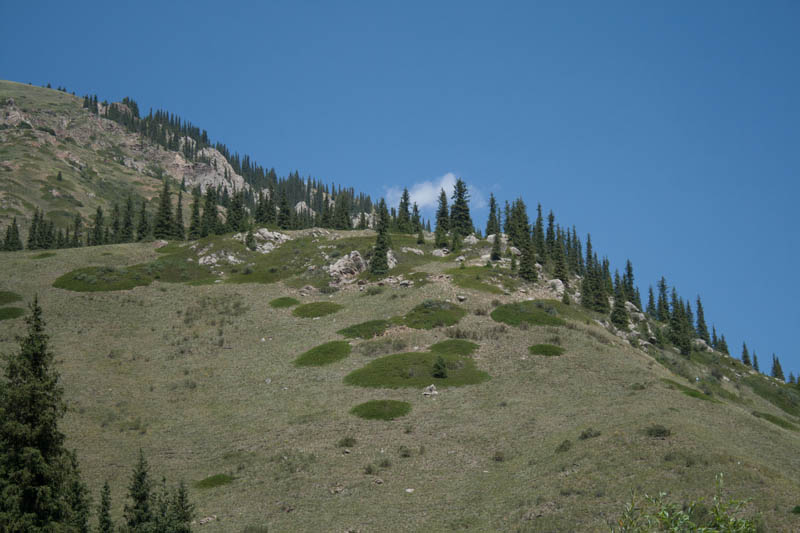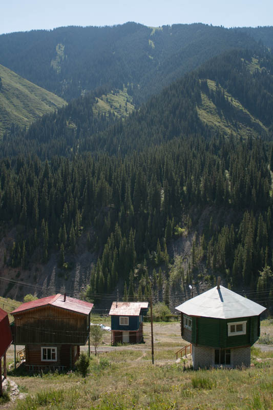 Das Wetter ist schlecht und unsere Vorräte fast aufgebraucht. Daher verzichten wir auf einen weiteren Aufstieg. Interessant wäre es schon gewesen. Die Baumgrenze beginnt hier erst bei 2800 Metern, und darüber gibt es angeblich Enzian- und Edelweißwiesen. Und von hier könnte man auch den Issyk-Kul in Kirgistan sehen; es sind dann nur noch ca. vier Kilometer bis zur Grenze.