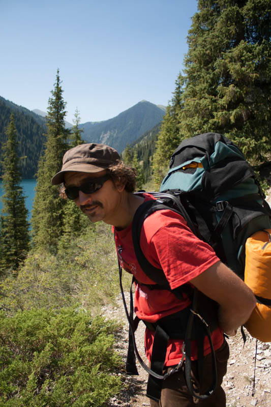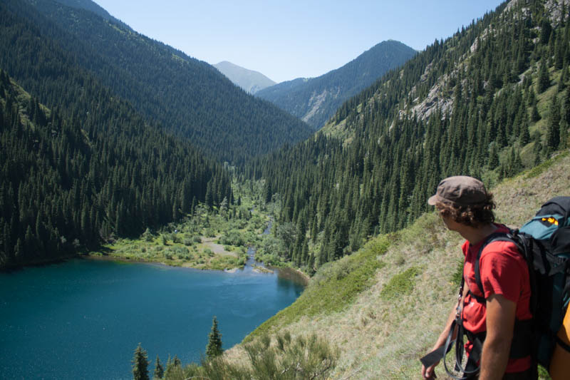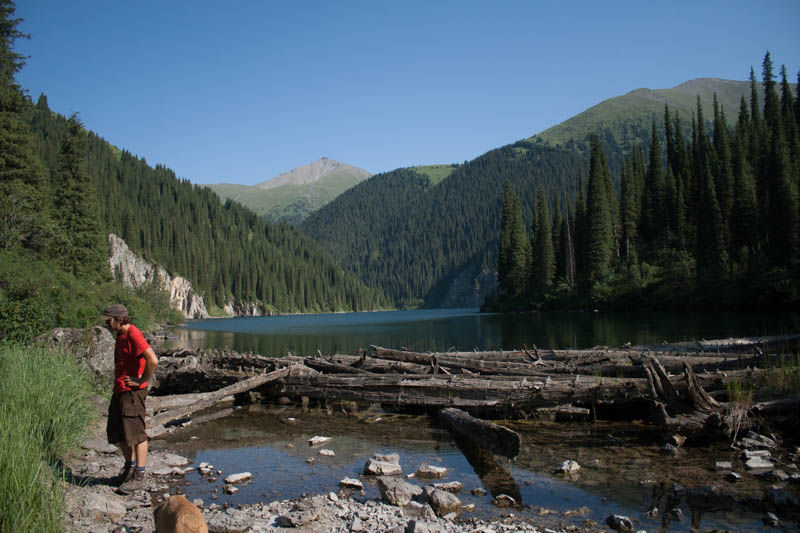 Also werden unsere Rucksäcke gepackt, und wir wandern los. Bis zum Ende des Sees sind es gut zwei Kilometer: Dort gibt es einen hübschen Rastplatz (oder möglichen Campingplatz) auf einer Art Insel. Hier fließt der Gebirgsbach, der die Seen verbindet, in den ersten See. Dort treffen wir die Tschechen. Honsa, Pepa, Pawel und Androsch kommen aus Prag, sind etwa so alt wie wir und sind für drei Wochen zum Wandern nach Kasachstan geflogen.