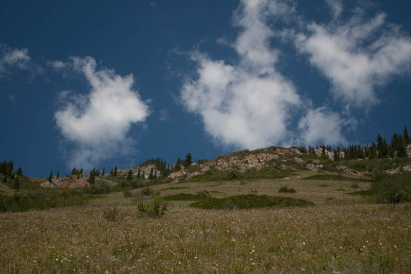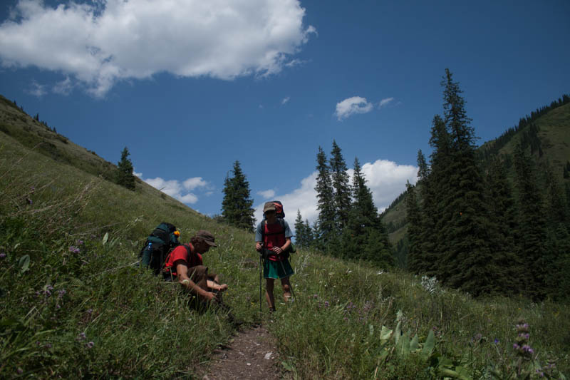 Mein Schnupfen quält mich. Ich bekomme keine Luft durch die Nase. Und so fällt mir der Aufstieg zu See drei auf 2670 Meter besonders schwer. Bis dorthin sind es zwar nur knapp sechs Kilometer, aber wiederum geht es über 400 Höhenmeter bergauf. Dafür wird der Weg immer schöner. Die Wiesen werden noch bunter, und die ersten Edelweiß blühen. Neben uns sind nur drei junge Leute aus Almaty am See.