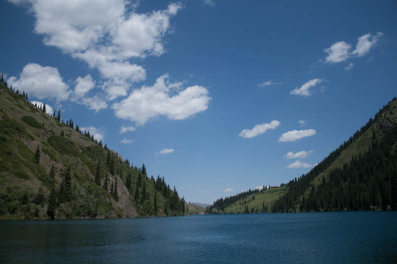 Am Morgen scheint die Sonne, und wir sehen uns erst mal um. Wir stehen auf einem geschotterten Parkplatz inmitten eines Bergpanoramas. Hinter uns befinden sich ein paar Mietjurten, und unter uns liegt der erste der Köl Say Seen und leuchtet türkisblau. Auf der uns zugewandten Seeseite befinden sich ein paar urige Holzhütten und ein kleines Hotel. Auch hier ist der Tourismus moderat, wenn auch unübersehbar, vorhanden.