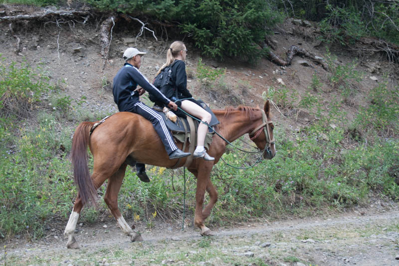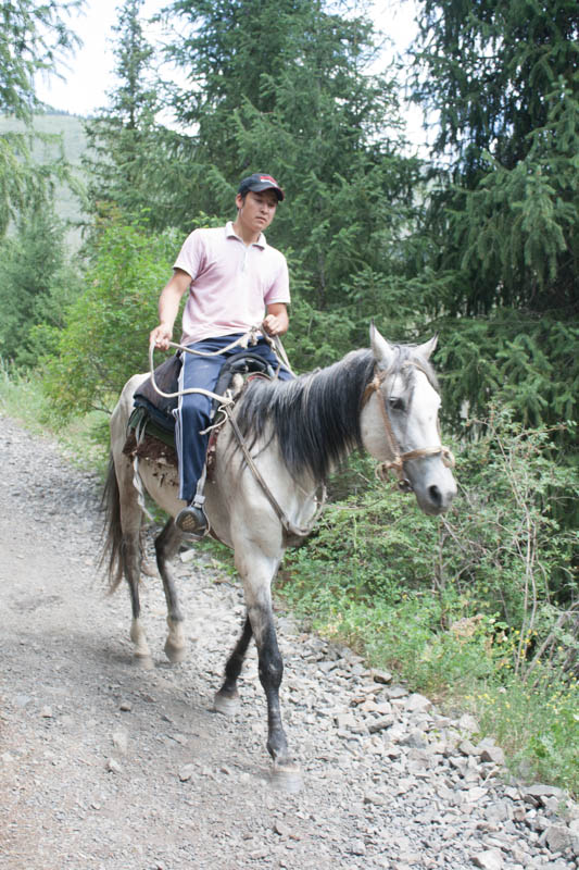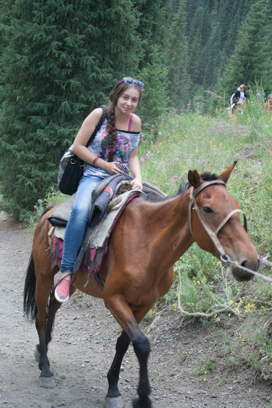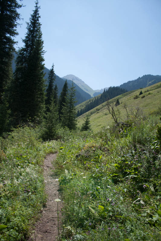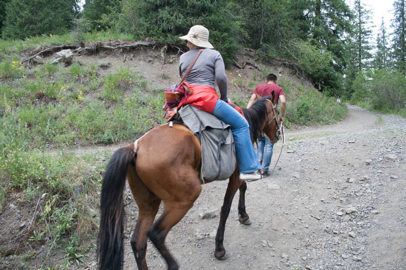 Wir lassen ihnen etwas Vorsprung und gehen, mit etwas Abstand, die weiteren acht Kilometer zu See zwei. Die Weg ist wirklich sehr schön, vorbei an Blumenwiesen voller Geranium, Dotterblumen und seltenen weißen und dunkelblauen Glockenblumen. Wälder, die aus der langen schlanken Tien-Shan Fichte bestehen, müssen durchquert werden. Allerdings ist der Aufstieg sehr beschwerlich. Die letzten vier Kilometer geht es kontinuierlich bergauf. Circa 450 Höhenmeter müssen erklommen werden. Wer will, kann sich auch auf dem Rücken eines braven Pferdes nach oben tragen lassen. Mir ist es unerklärlich, wie die Tiere den steilen Trampelpfad bewältigen können.