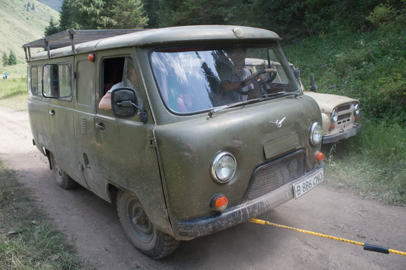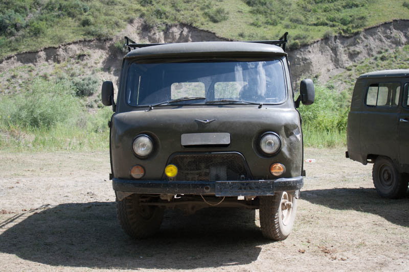 Kurz vor Saty (außerhalb der Schlagbaumzone) haben wir gestern Abend noch einen idyllischen Platz gefunden. Der Fluss neben uns läuft wild schäumend und milchig weiß an unserem Fenster vorbei. Auf der anderen Seite fließt ein klarer, kalter Gebirgsbach. Kühe stehen vor unserm Lastwagen. Ab und zu reitet ein Hirte vorbei, der mit uns ein kleines Schwätzchen hält. Ideal um hier zu lagern, unsere Zelte und Schlafsäcke zu trocknen, Wäsche zu waschen und weiter an meinem Blog zu arbeiten.