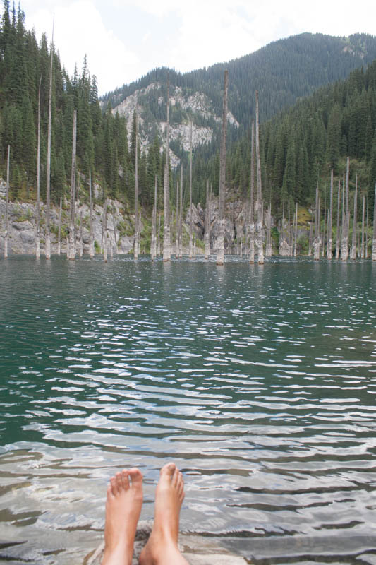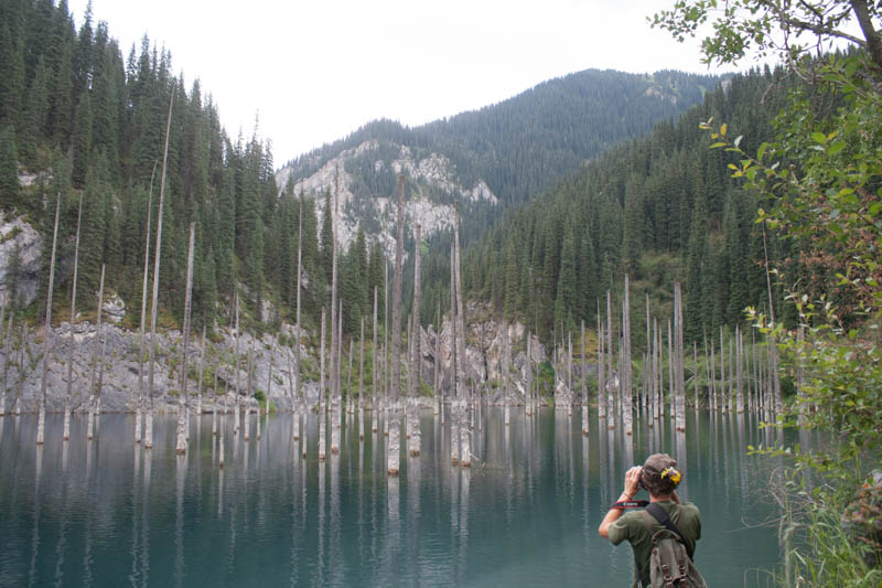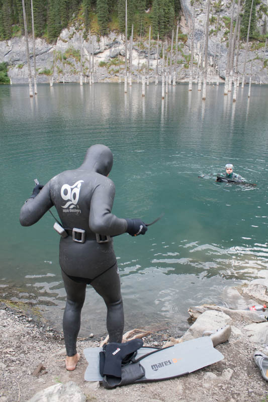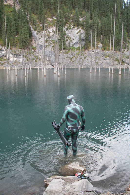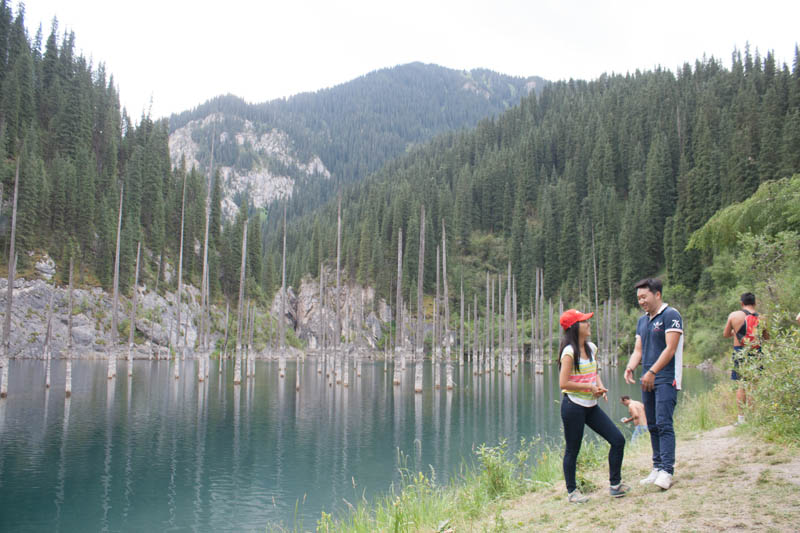 Bei Saty gibt es noch eine weitere Attraktion, die uns von allen (Einheimischen wie Reisenden) dringend ans Herz gelegt wurde: Der Koindy See. Der erst gut 120 Jahre alte See entstand durch einen Erdrutsch, und so ragen immer noch die Spitzen der Tien-Shan-Fichten aus dem Wasser, was ziemlich kurios aussieht. Allerdings ist heute Sonntag, und der See ist anscheinend eine solche Sehenswürdigkeit, dass reisebusweise Menschen aus Almaty und Umgebung angekarrt werden. So viele Touristen haben wir schon lange nicht mehr auf einem Haufen gesehen. Wir treffen den Schnellreisenden Paul aus Dinkelsbühl, Maksud, den kasachischen Geologen, der uns mit Stolz geschwellter Brust von den Bodenschätzen seines Landes erzählt und die zwei sonnenverbrannten Rucksacktouristen Dorothé und Bergerac (oder so ähnlich) aus Frankreich. Am See gibt es die übliche Picknickfraktion in Schnapslaune, aber auch zwei Apnoetaucher aus Almaty, die wir beim Tauchgang beobachten können. Sie schaffen es, mehrere Minuten ohne Sauerstoff unter Wasser zu bleiben und zwanzig Meter tief zu tauchen. Da bekomme ich schon Atemnot vom Zusehen!