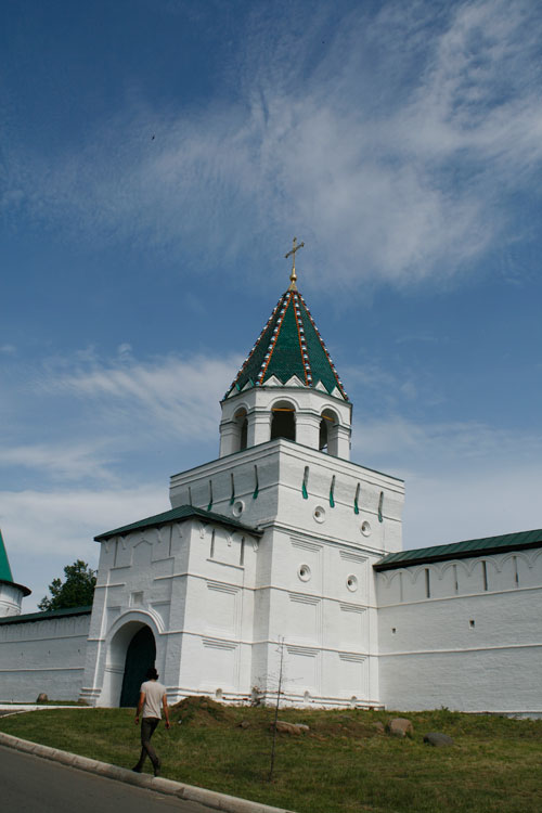 Die moderne Industriestadt Kostroma steuern wir an, weil sich hier das Museum für Russische Holzbaukunst befinden soll. Die Beschilderung hier ist aber so dürftig, dass wir mehrfach anhalten und nach dem Weg fragen müssen. Schließlich erbarmt sich ein netter Herr; er fährt voraus und zeigt uns, wohin wir sollen.  Das stolze Kloster liegt direkt an der Wolga, und dahinter erstreckt sich ein weitläufiges Gelände, auf dem alte Holzhäuser, Kirchen und Windmühlen gesammelt werden.