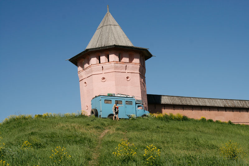 Wir finden einen königlichen Stellplatz direkt am Kreml, mit Blick über die Stadt und das Flüsschen.